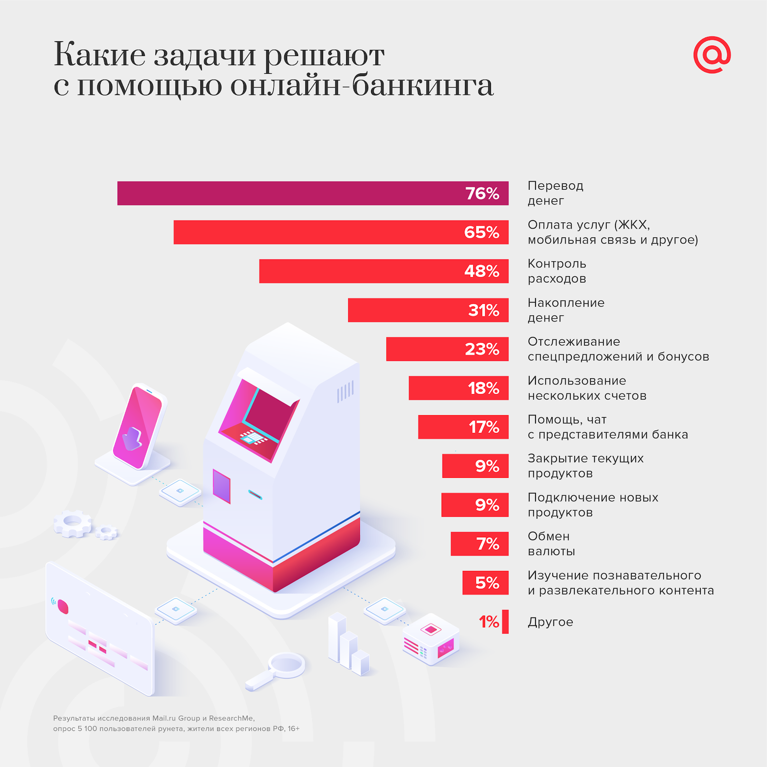 Пользователи выбирают интернет-банкинг в первую очередь для решения трех основных задач: перевода денег (76%), оплаты услуг (65%) и контроля расходов (48%). Женщины чаще мужчин используют приложения, чтобы получить помощь и пообщаться с представителями банков в чате – 19% против 14%. Среди мужчин больше тех, кто использует мобильные приложения банков для обмена валюты (9% против 5% женщин).