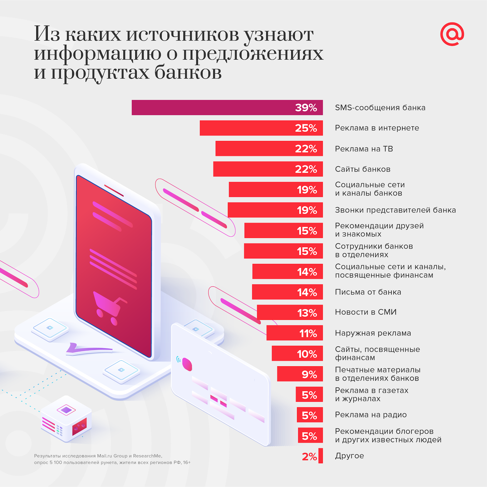 Сейчас пользователи чаще всего узнают о новых продуктах и предложениях банка из SMS (39%), интернет-рекламы (25%), ТВ-рекламы и сайтов банков (по 22%).