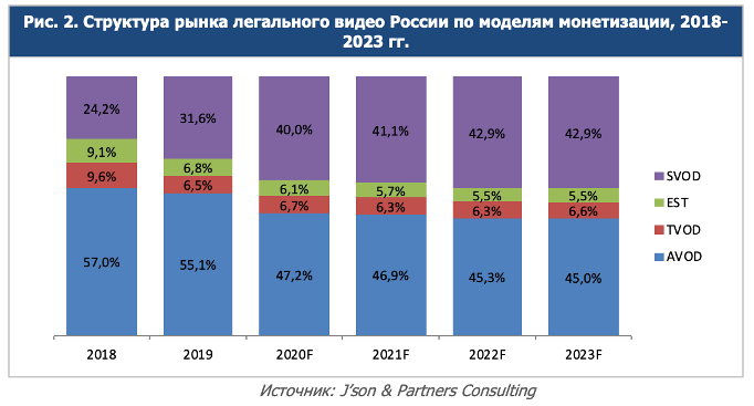 С учетом всех факторов, которые будут влиять на развитие рынка, прогноз на период 2020-2023 гг. выглядит следующим образом (см рис 2). Уже в 2020 году доля модели AVOD станет менее 50%.