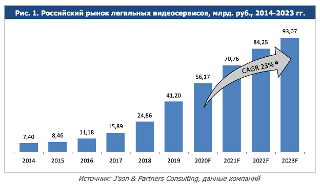 Общая выручка рынка легальных видеосервисов от предоставления услуг в России в 2019 году составила 41,2 млрд. рублей без НДС (+65,7%). В 2019 году она рассчитана с учетом пересечений выручки в результате партнерства различных игроков между собой.