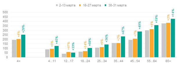 Существенный прирост аудитории произошёл сразу во всех возрастных группах телезрителей. Сильнее всего телепросмотр увеличился среди населения младше 55 лет: в аудитории 4-11 лет – на 45%, 12-17 лет – на 33%, 18-24 лет – на 69%, 25-34 лет – на 36%, 35-44 лет – на 47%, 45-54 лет – на 49%. В предыдущие две недели марта аудитория росла в основном среди молодых жителей Москвы до 24 лет, в остальных возрастных группах прирост был менее заметным.
