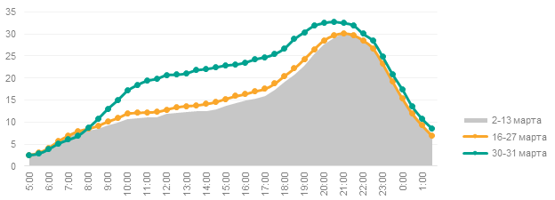 Телеаудитория увеличивалась в течение всего дня, но сильнее всего – в активное дневное время, которое жители столицы обычно тратят на работу в офисах или учебу. В понедельник и вторник, 30-31 марта, аудитория днем выросла на 60-70% по сравнению с буднями в период 2-13 марта.