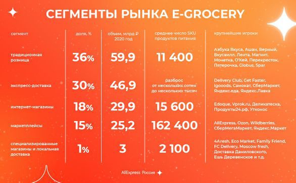 AliExpress Россия и Центр экспертиз и интегральных моделей (ЦЭИМ) исследовали российский рынок e-grocery. По прогнозам экспертов, объём рынка по итогам 2021 года составит 300 млрд рублей, к 2023 году он может достигнуть 500–600 млрд руб, а при сохранении темпов роста к 2025 году — 1 трлн рублей. Основными каналами продаж останутся традиционная розница, экспресс-доставка, интернет-магазины, маркетплейсы и специализированные магазины (локальная доставка). Уже сейчас маркетплейсы лидируют по ассортименту продуктов питания, хотя в денежном выражении на них приходится лишь 15% рынка.