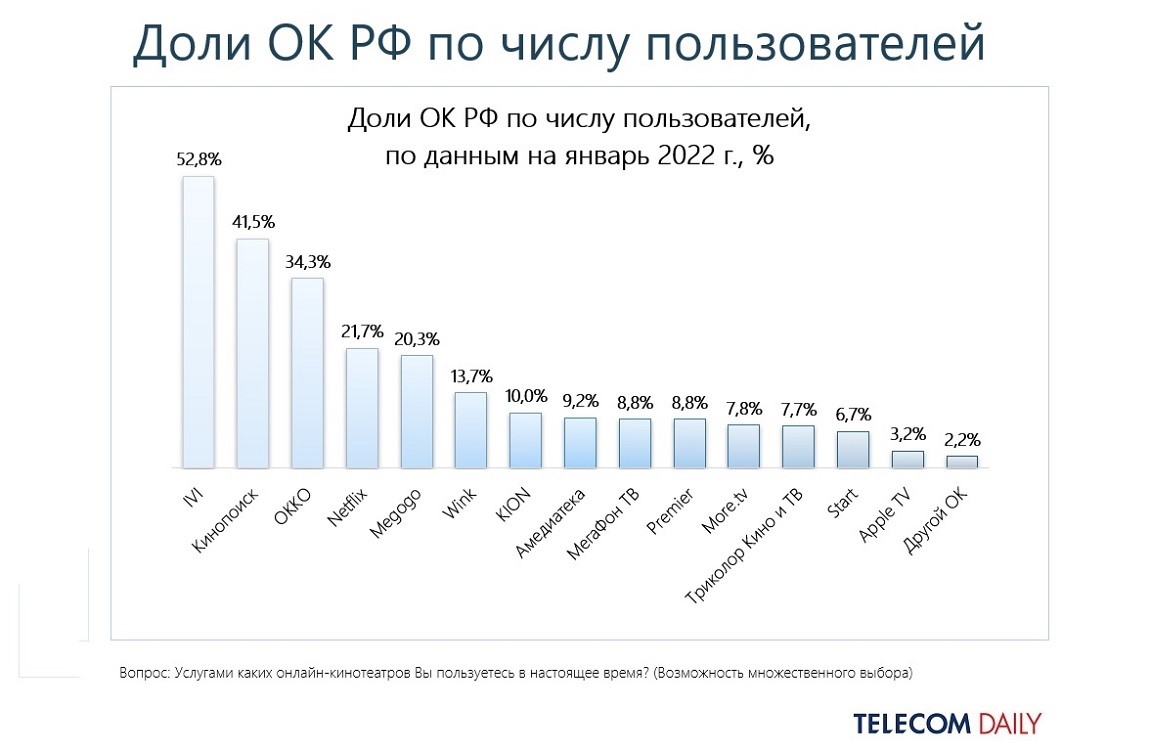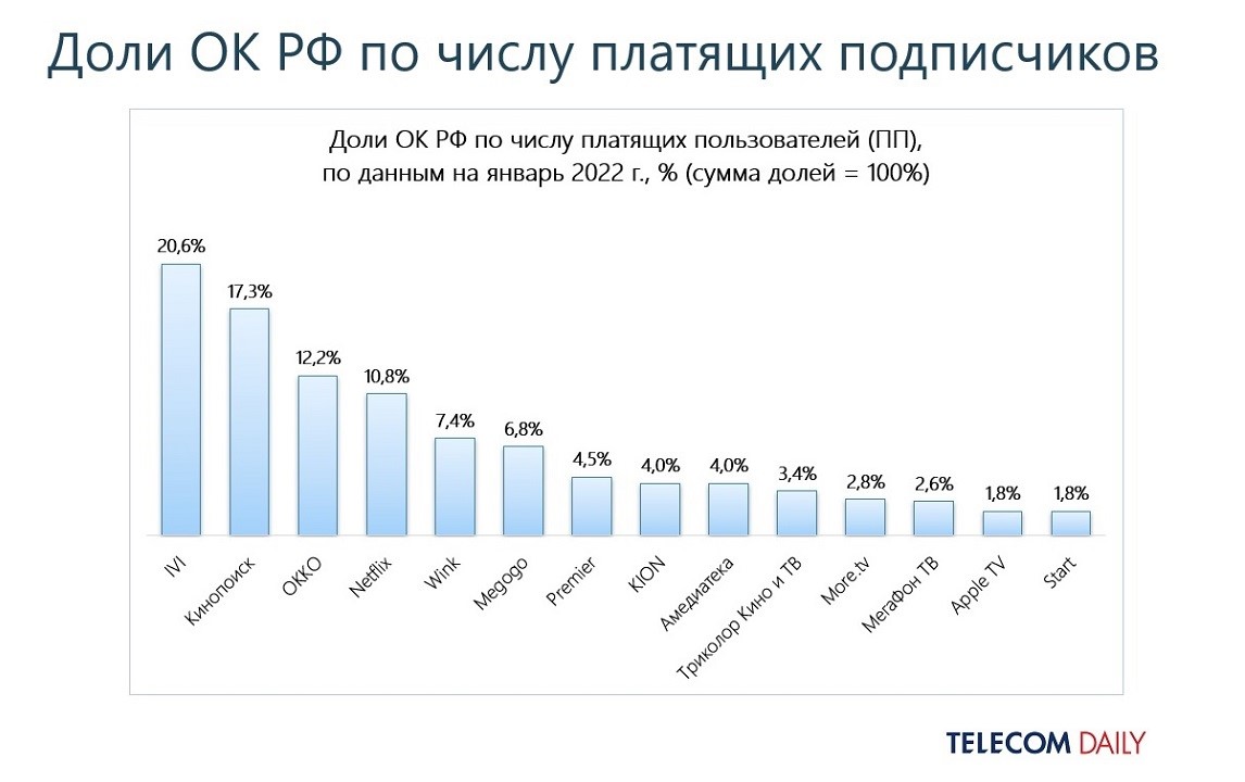 По итогам 2021 года первая пятерка онлайн-кинотеатров (ivi, «Кинопоиск», Okko, Netflix, Megogo), лидирующих по количеству зрителей, почти тем же составом удерживает верхние строчки и по количеству платных подписок. А вот в топе кинотеатров с самыми лояльными пользователями (теми, кто платит за сервис больше года) картина меняется: «Кинопоиск», ivi, Wink, Netflix и Окко.