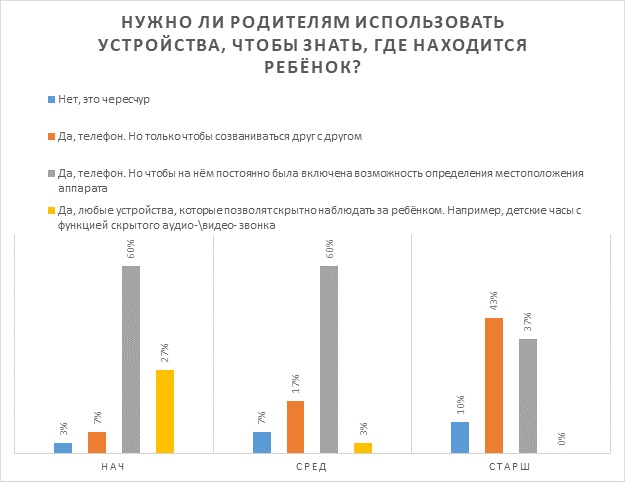 ИБ-специалисты, как видим из результатов опроса, – тревожные родители. Единицы считают, что использовать устройства для определения местонахождения ребенка не нужно, даже родители старшеклассников. Правда тех, кто доверяет гаджетам вроде смарт-часов, немного даже среди родителей младшеклассников. Большинство опрошенных предпочитают использовать для контроля мобильные телефоны: чтобы созваниваться или что-то использовать приложения для определения геолокации.