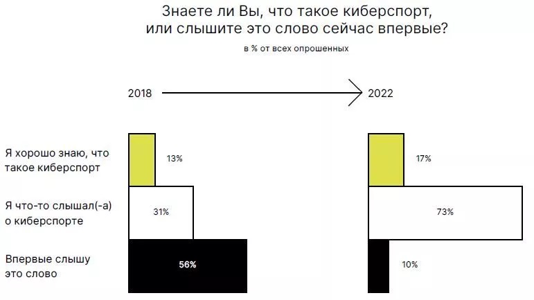 Доля тех, кто впервые слышит термин «киберспорт», снизилась по сравнению с данными 2018 года более, чем в 5 раз.