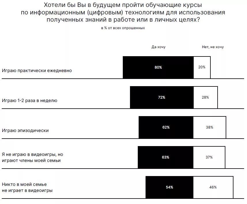 Так, подавляющее большинство геймеров, ежедневно уделяющих время видеоиграм (80%), выразили желание в будущем пройти дополнительное обучение по работе с информационными технологиями – другими словами, повысить собственный уровень цифровой грамотности.