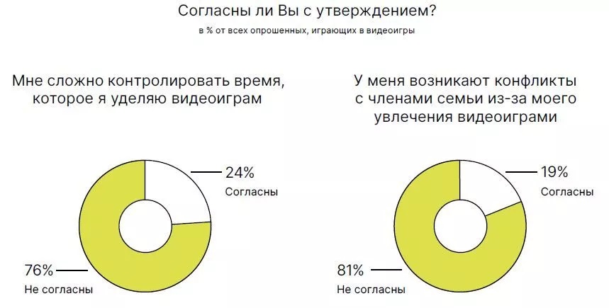 У 19% геймеров возникают конфликты с другими членами семьи из-за увлечения видеоиграми. Чаще всего это представители молодежи 18-24 лет (32%), владельцы бизнеса (30%), мужчины (22% против 15% среди женщин).
