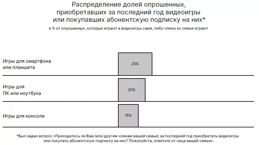 22% россиян, которые увлекаются видеоиграми сами, либо имеют геймеров среди членов семьи, за последний месяц совершали покупки в видеоиграх, заводили денежные средства на счет игры, либо приобретали предметы в игре.