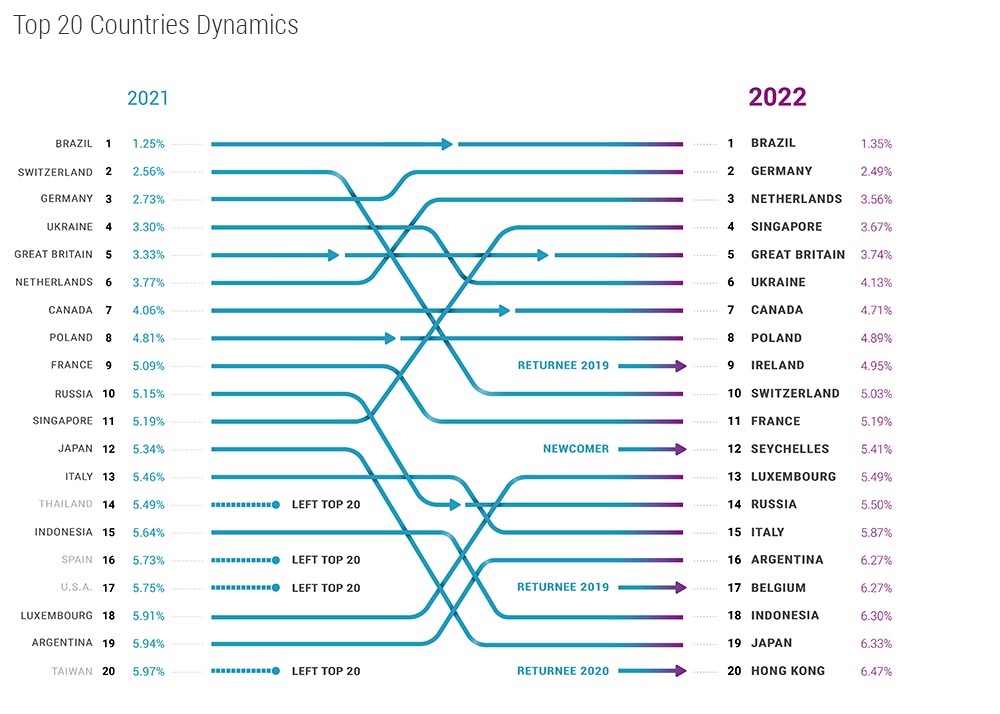 - Ирландия, Бельгия и Гонконг вновь вошли в Топ-20 после покидания рейтинга в 2021 году