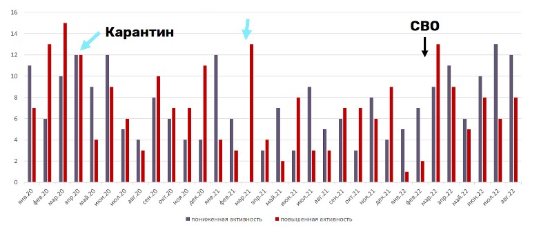 Аномальная активность в компаниях наблюдалась только во время первого локдауна в апреле 2020 года. Часть клиентов сервиса стала чаще коммуницировать со своей аудиторией, чем обычно в этом месяце. Ровно такое же количество выбрало противоположную стратегию, снизив свою активность до минимума. В среднем трафик получился обычным и никак не выделялся на общем фоне.