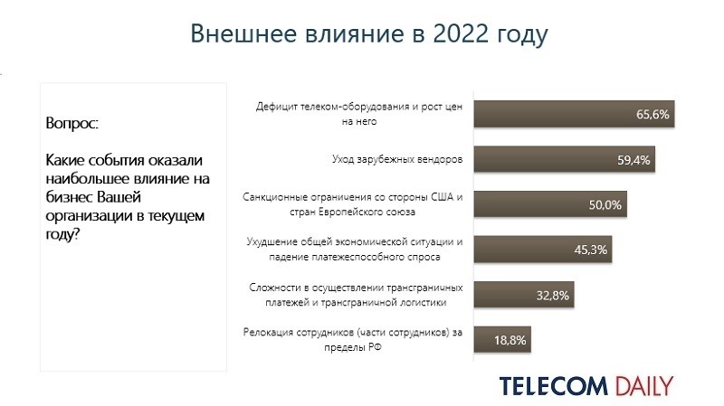 В уходящем году внешние факторы негативно повлияли на телекоммуникационный бизнес. Большинство компаний (66%) указывают на дефицит оборудования, связанный с санкционными ограничениями, и как следствие — на рост его стоимости. Еще одним крайне значимым отрицательным последствием для 59% опрошенных стал уход мировых вендоров.