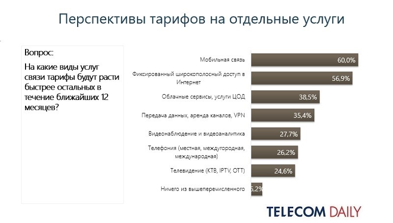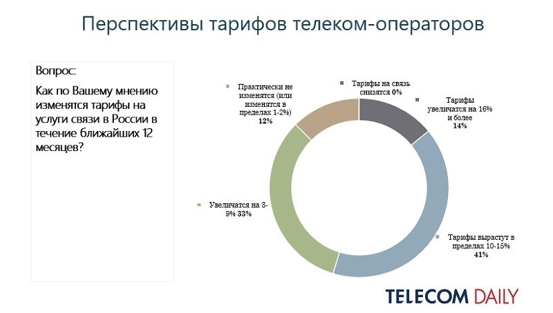 TelecomDaily публикует пятое ежегодное исследование-опрос, в котором представители операторских компаний делятся ожиданиями по поводу тарифной политики. Эксперты агентства отмечают, что результаты текущего опроса действительно могут свидетельствовать о подготовке к росту тарифов, особенно в самых востребованных сегментах — фиксированный доступ в интернет и мобильная связь.