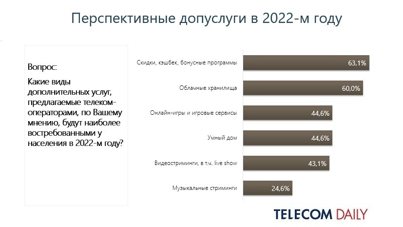На вопрос, какие опции/сервисы станут наиболее востребованными в следующем году, представители операторов ответили определенно — скидки, кэшбэк и бонусные программы. За них высказались 63%. Облака набрали сразу 60%, хотя в прошлом году не входили в первую тройку. А вот лидировавшие в конце 2021 онлайн-игры и игровые сервисы переместились на третье место — у них 45% голосов.