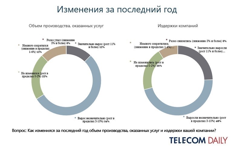 Рынок телекоммуникаций РФ, по сравнению с 2021 годом, не показал заметного роста. Если годом ранее сразу 81% респондентов констатировали рост годового объема услуг, то по итогам 2022 их доля составила 66%.
