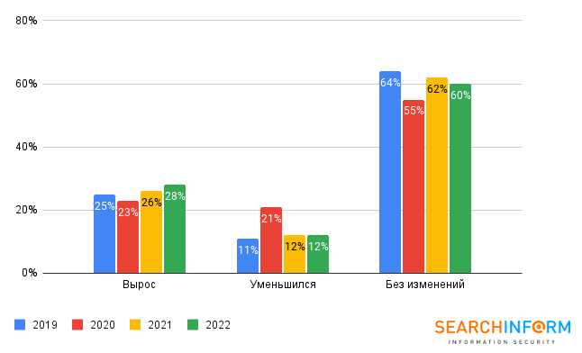 Общая картина выделения бюджетов заметно отличалась только в 2020-м пандемийном году, когда компании были вынуждены экстренно переориентироваться под удаленный формат работы и вопросы безопасности откладывали. Примерно в 60% компаний бюджет остается без изменений, при этом информационная безопасность в компаниях недофинансирована – оснащенность защитными средствами остается недостаточной. По данным нашего прошлогоднего исследования меньше половины компаний в России внедряют в свою работу серьезные средства защиты от кибератак, а большинство обходится только антивирусом.
