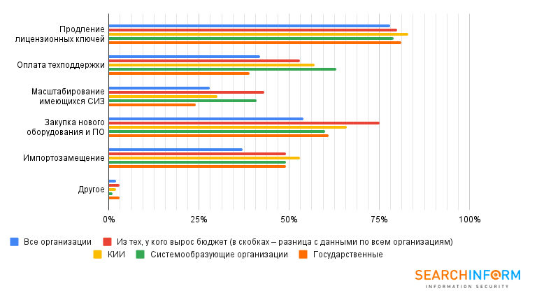Компании чаще всего выделяют бюджет на продление лицензионных ключей (78% опрошенных), на закупку нового оборудования и ПО (54%). По всем организациям, которые относятся к субъектам КИИ, системообразующим или операторам ПД эти цифры выше.