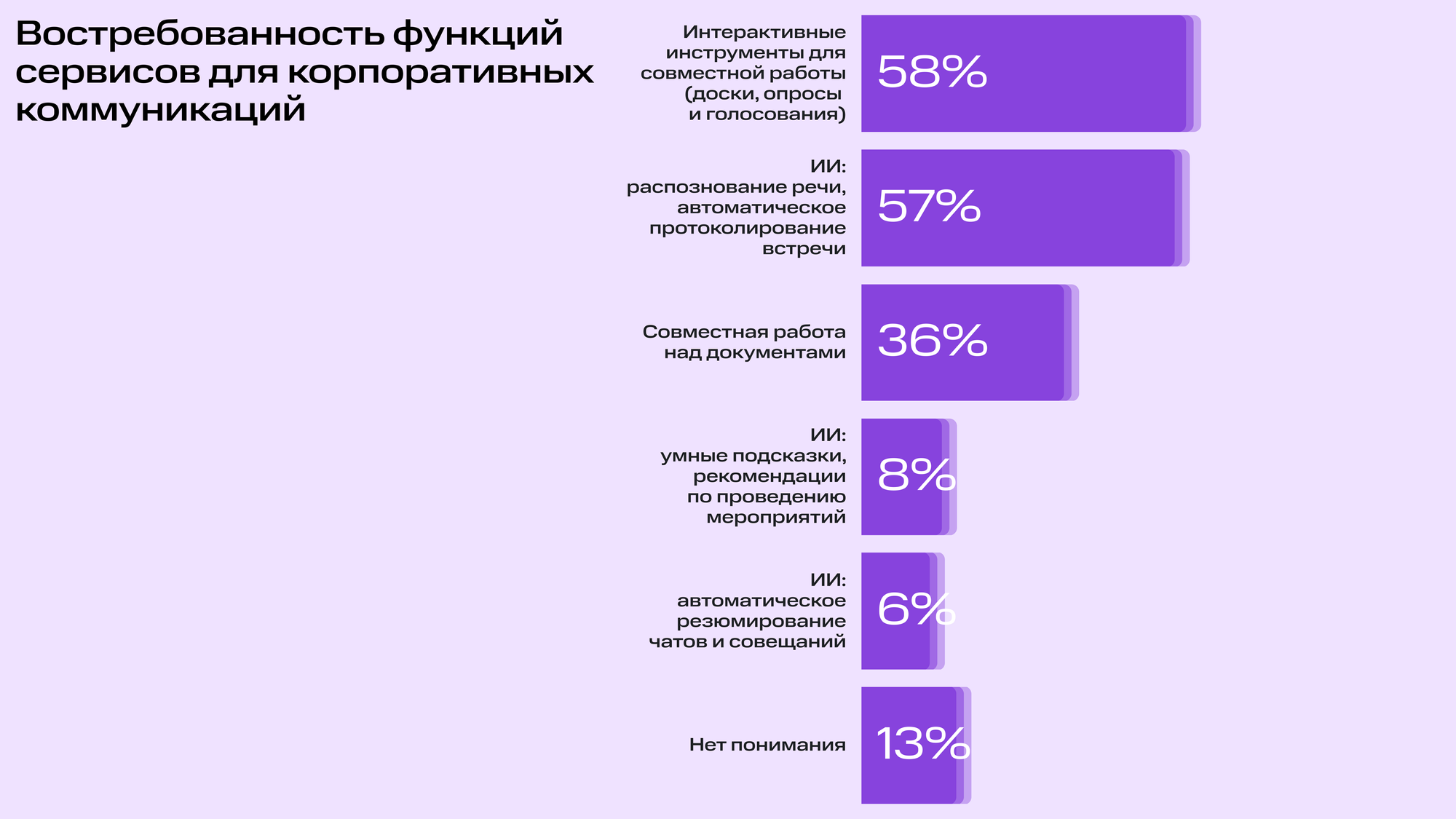 «Исследование показало, что 92% российских организаций одинаково часто используют в работе как очный, так и онлайн-формат делового общения. Если во время пандемии COVID-19 онлайн-взаимодействие превалировало, то сегодня популярность набирают гибридные коммуникации. Мы также оценили востребованность функций платформ: более 50% респондентов подтвердили интерес к интерактивным инструментам в сервисах онлайн-коммуникаций (в том числе для проведения опросов, голосований); почти столько же опрошенных заинтересованы в применении технологий искусственного интеллекта (ИИ) для распознавания речи; 36% считают важными инструменты для совместной работы над документами в онлайне. Мы в МТС Линк активно работаем над таким инструментарием: запустили в ограниченное тестирование транскрибацию и резюмирование встреч, планируем добавлять новые инструменты ИИ во все наши сервисы. Важно также отметить тенденцию на объединение всех видов коммуникаций “в одном окне” — использовать одну платформу гораздо удобнее, чем ряд разрозненных приложений», — отмечает директор по продукту МТС Линк Александр Бровко.