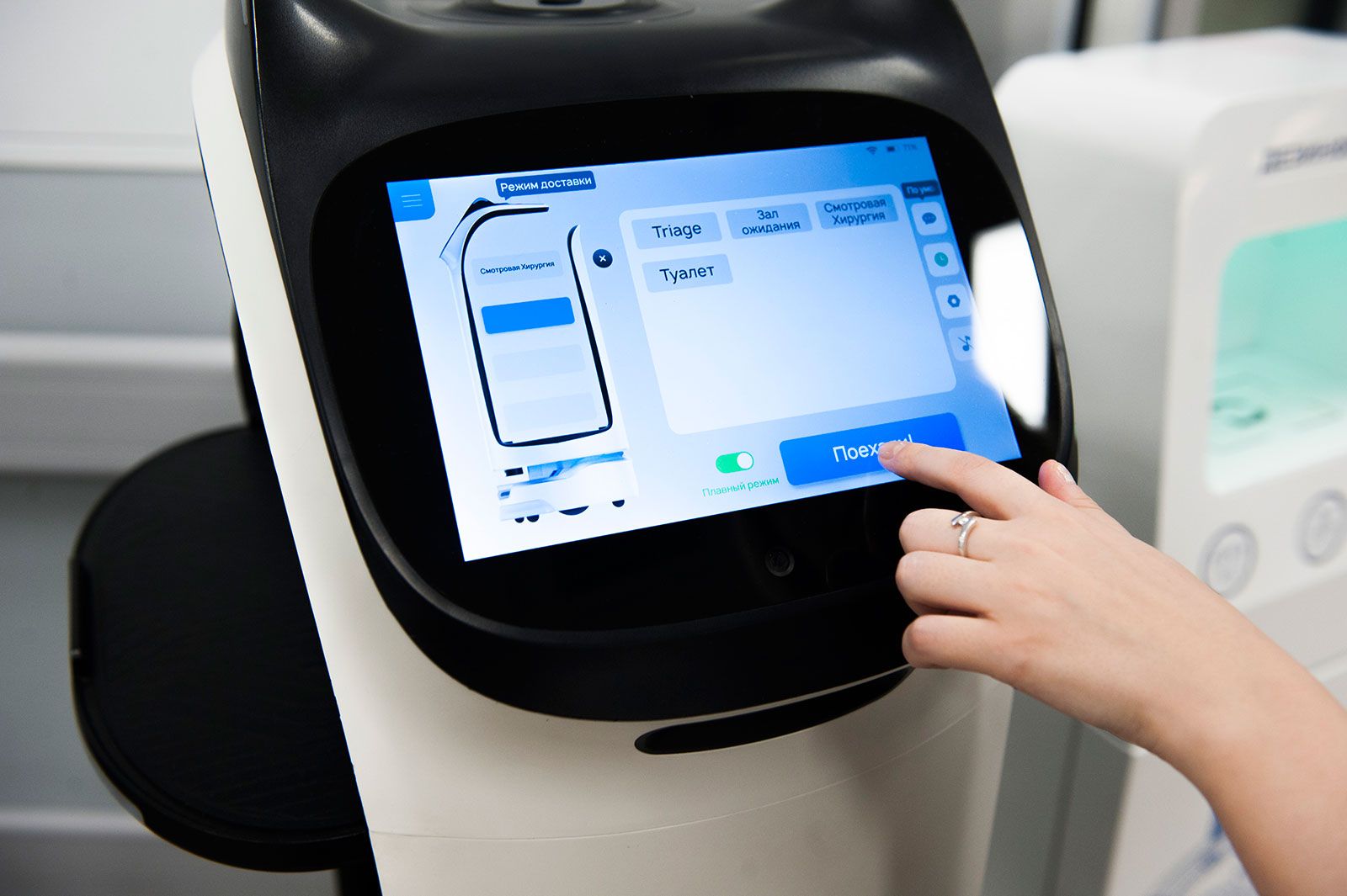 Чтобы включить такого робота, следует прикоснуться к его дисплею, выбрать нужный пункт меню и нажать кнопку «Поехали!». После завершения маршрута робот автоматически возвращается на свое место в приемное отделение в зону триажа, где происходит процесс выявления пациентов, нуждающихся в срочной медицинской помощи, либо к регистратуре.