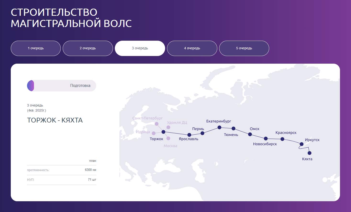 ВОЛС планируется вводить в эксплуатацию поэтапно. Первая и вторая очередь первого этапа общей протяженностью около 1 400 км, соединяющих Москву и Санкт-Петербург, а также продление между городами Идрица в Псковской области и Торжок в Тверской области, будут запущены в коммерческую эксплуатацию в I квартале 2024 года. До конца 2025 года планируется завершить первый этап целиком, продлив линию до Монголии и Китая. В 2026 году будет полностью готова вся наземная часть линии связи, которая входит во второй этап стройки, проходящей по территории России. Параллельно будет обеспечена необходимая инфраструктура для международных продлений линий, входящих в третий этап реализации проекта.