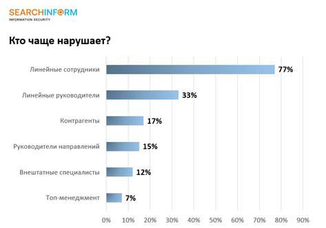 Среди виновников нарушений респонденты называют рядовых сотрудников. За год этот показатель вырос на 10% – до 77%. В 33% компаний заявили о том, что виновники инцидентов – линейные руководители. Доля нарушений среди контрагентов составила 17%, руководителей направлений – 15%, внештатных специалистов – 12%, топ-менеджмента – 7%.