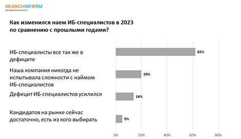 Результаты опроса также показали, что ИБ-специалисты в сфере ритейла по-прежнему в дефиците. Так ответили 62% опрошенных. 14% респондентов сообщили, что дефицит ИБ-кадров усилился. 20% ритейлеров отметили, что никогда не испытывали сложности с наймом специалистов.
