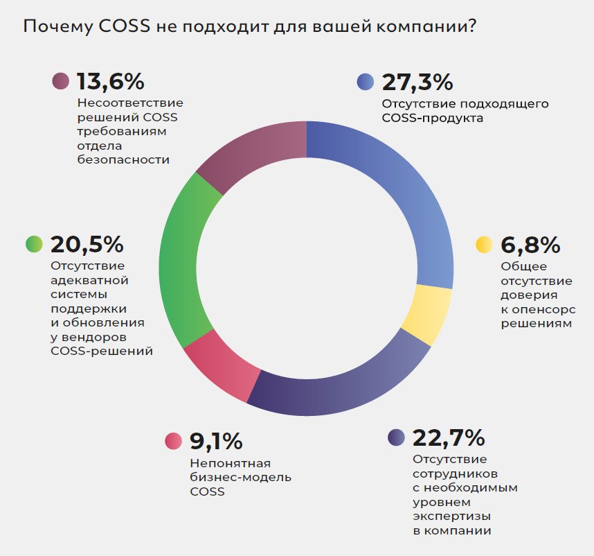 Исследование показало, что отсутствие сотрудников с нужным уровнем экспертизы и адекватной системы поддержки и обновления у вендоров является одной из основных причин (наряду с отсутствием подходящего COSS-продукта), которые отталкивают клиентов от open source – решений.