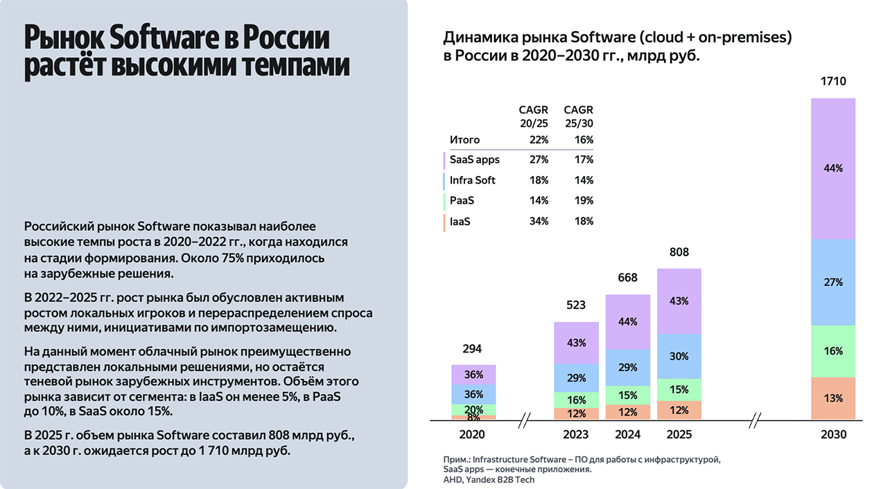 В 2025 году объем российского рынка ПО составил 808 млрд рублей с перспективой роста к 2030 году до 1,7 трлн рублей. Значительная часть рынка приходится на долю облачных решений - по итогам 2025 года объем этого сегмента оценивается в 312 млрд рублей, к 2030 году — до 835 млрд рублей.